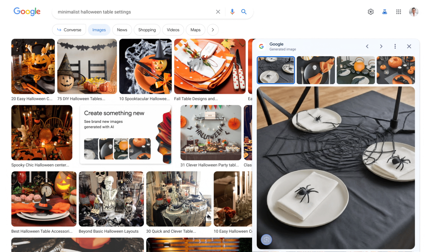 Additionally, SGE is also providing an amazing option to generate images directly from google images. You can see this feature to appear when you’re searching for inspiration, like “minimalist Halloweens table settings”.