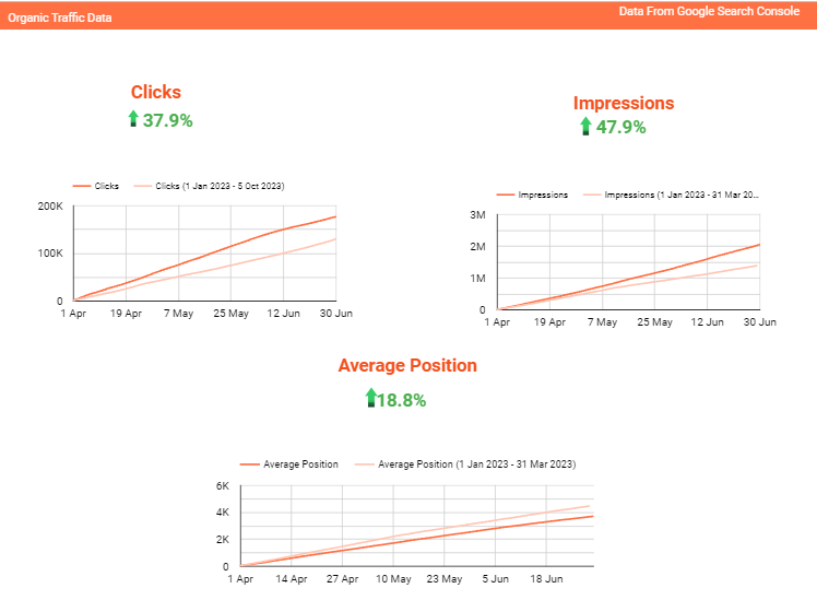 - Organic clicks – Surge by 37.9%, signaling a substantial boost in organic visibility and click-through rates